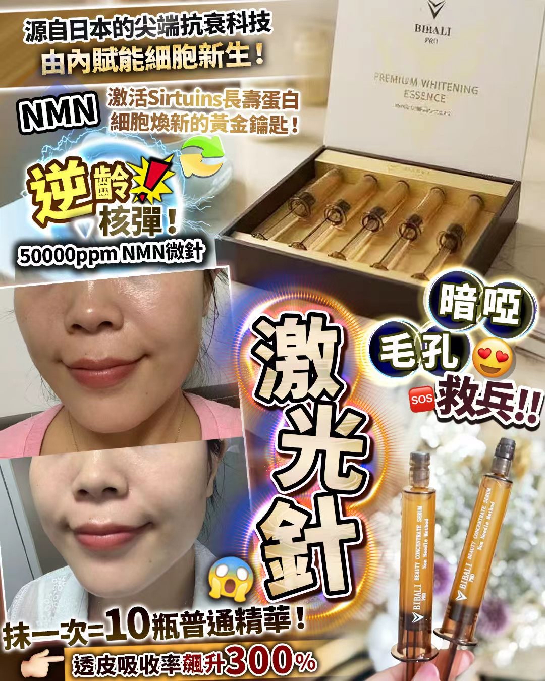 📦訂 約2-3 星期 全新日本產品 NMN #激光針 捱夜下垂 細紋暗沉 暗瘡印 色斑 一盒5支 雙效逆齡 ✨✨ 💉 蘊含高活性NMN,直達肌底激活細胞能量,喚醒年輕力!微針緩釋技術,無痛導入,吸收率飆升🔝!感覺臉蛋嘭彈緊致,毛孔隱形,透出健康光澤~ 隔天用一次 5次 >搽普通精華1個月效果 矽針打開萬倍吸收通道 吸收率 300% Day1透亮✨ Day7緊如皮筋🎯 促進膠原 & 彈性蛋白生成+20% •網狀結構纖維的轉糖化作用 助力蛋白結構健康 改善皺紋、鬆弛,提升肌膚緊致度和彈性 細胞新生+26% 修復損壞細胞和結構纖維 抗氧化與抗炎+16% 幫助中和自由基 減輕氧化應激和炎症反應 從根源減少糖氧損傷 50000ppm NMN能量直輸肌底!NMN加速DNA修復×激發ATP供能,3倍速掃除自由基黃氣;協同傳明酸阻斷炎症色沈通路。晨起鏡中倦容消失,毛孔細膩度提升32%。 塗抹式NMN因分子量滯留表皮?海綿骨針突破生死線!50000ppmNMN借骨針微通道直抵真皮,吸收效率碾壓傳統92%;配α-熊果苷精准分解色素團 ,色斑淡化速度提升5倍 使用方法 : 方法1 : 隔天一次 晚上潔面後 取適量 當作日常精華全臉薄薄一層塗抹後 再塗面霜 方法2 : 一星期1至2次 ( 每次半支 )潔面後 全面塗抹後按摩再敷保濕面膜 8ml x 5 支 日本製