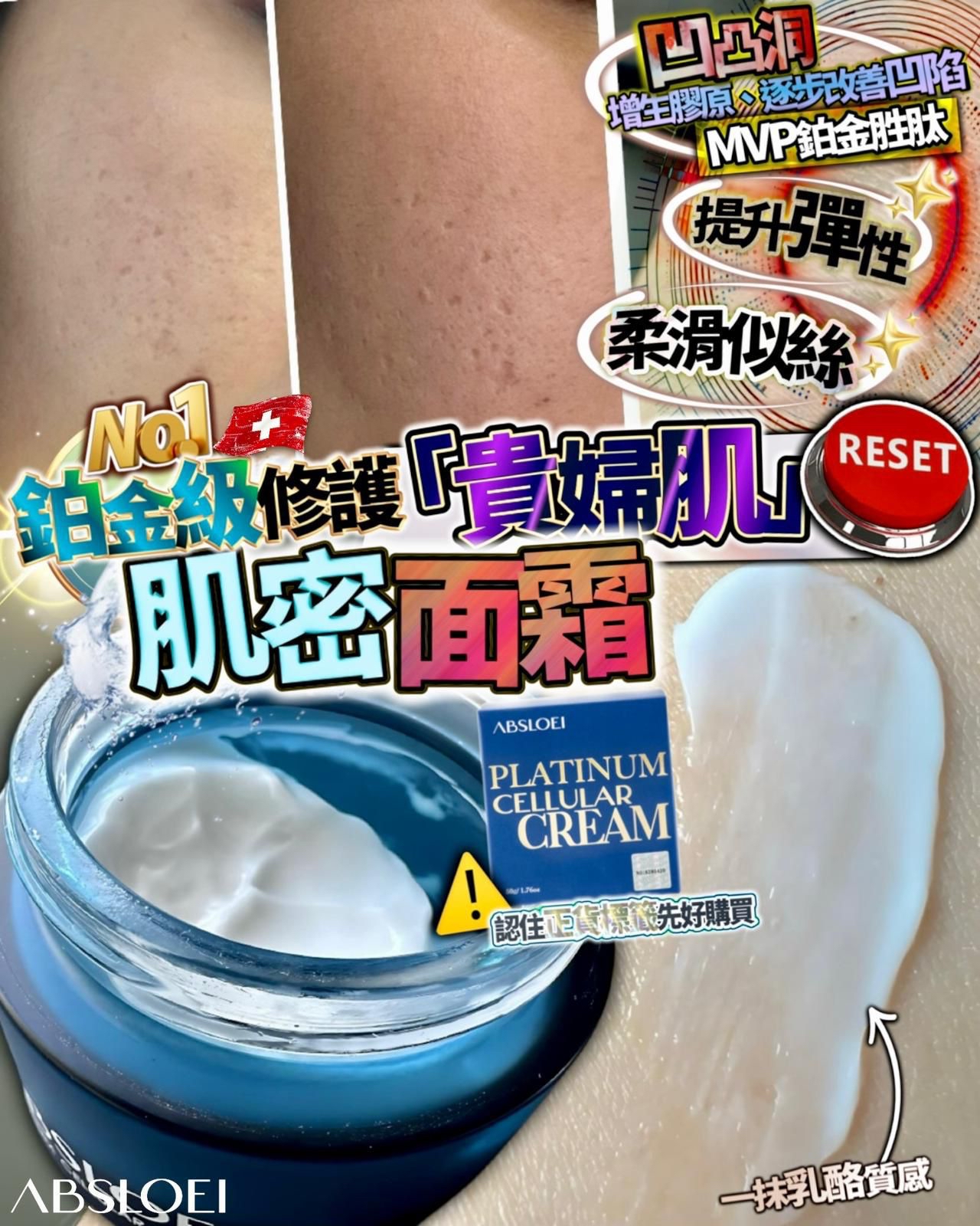 📦訂 約2-3 星期 💥【缺貨警報】💥ABSLOEI 鉑金肌密面霜最後80個‼️ - 小編都要自留返5、6個😍 轉季入冬必備聖品 #真係搶到瘋🤩🤩🤩 - 呢款面霜係瑞士高科技結晶✨,用珍罕成分,慢工出細活🕑,一抹即融,乳酪質地超輕盈🌬️,直滲肌底,幫你KO各種肌膚煩惱: 🔥 平滑到似絲絨 🔥 保濕到飲飽水 🔥 皺紋ByeBye 🔥 凹坑即刻Fill 🔥 毛孔隱形術 🔥 黃氣Out,白皙In 🔥 膠原BB彈不停 🔥 輪廓V到飛起 - 💎 八大王牌成分 💎 逐層修護,由外到內靚晒: 💙 MVP鉑金胜肽:抗老神器,膠原增生So Easy ❤️ Matrixyl®️3000:科學認證,皺紋減61%、彈性Up47% 💜 瑞士雪藻提取物:抗氧化+保濕,肌膚壓力即釋放 🖤 馬蘭花幹細胞:細胞修復,返老還童 💚 透明質酸:吸水小海綿,肌膚水汪汪 🤎 乳木果油脂:滋潤乾紋,柔滑到飛起 💜 角鯊烷:模擬肌膚天然保護,鎖住營養 🤍 棉花油:溫柔呵護,敏感肌都Like - 容量50ml 瑞士製造
